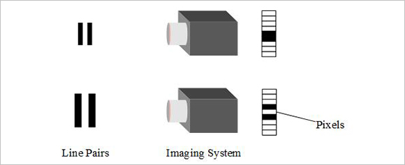 光学成像系统的分辨本领指该系统能否分开两个靠近的点或物体细节的能力,通常以每毫米可以识别的线对数(cycles/mm)来表示光学成像系统分辨率的大小。线对由一条黑线和一条白线组成,光学成像系统能分辨的每毫米线对数越多,分辨能力越好,分辨率越大。如图1所示为光学成像系统最大分辨率示意图,上边线对的线宽和线距较小,成像系统无法分辨;下边线对的线宽和线距有所增加,成像系统正好分辨,该线对对应的每毫米线对数即为成像系统的最大分辨率。