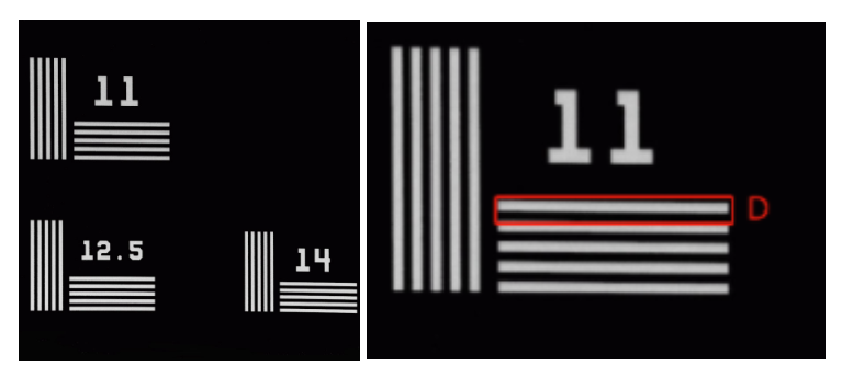1963A分辨率测试靶包含五条水平线和五条垂直线。如图2所示为NBS 1963A分辨率测试靶部分线对在显微镜下的图片,该测试靶采用5条线一个集合,每条线及它与相邻线的间距可看作一个线对或一个周期(如图2中D所示)。每个测试靶能够测试的分辨率以cycles/mm的频率给出。在NBS 1963A测试靶上,每个线集都标有频率。确定可分辨的最小线(最高的cycles/mm数值)从而可确定成像系统分辨率。