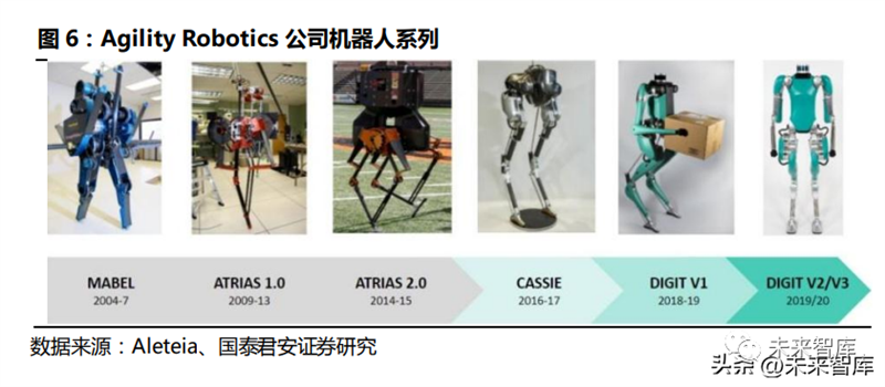 Digit 系列机器人(2019~2023):具备行走能力,专注物流领域商业化。Digit 系 列是 Agility Robotics 公司在物流领域商业化的尝试,公司是从俄勒冈州立大学 (OSU)拆分出来的机器人公司,致力于研发和制造双足机器人,前后开发了 MABEL、ATRIAS、CASSIE、DIGIT 系列足式机器人。其中 CASSIE 可实现 4m/s 的 惊人配速,是腿足式机器人在快速行走能力上里程碑式的成果。2019 年,Agility 推 出了人形机器人 Digit,在 Cassie 的基础上加上了躯干、手臂,并增加了更多计算 能力,支持负载 18kg 的箱子,可进行移动包裹、卸货等工作。