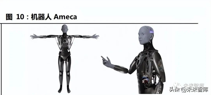 交互型机器人索菲亚(2015)和阿梅卡(2021),面部表情拟人化的尝试: 索菲亚 (Sophia)是由汉森机器人技术公司(Hanson Robotics)开发的类人机器人,2015 年面世。索菲娅皮肤由 Frubber 仿生材料制成,基于语音识别、计算机视觉技术, 可以识别和复制各种各样的人类面部表情,并通过分析人类表情和语言同人类对话。阿梅卡(Ameca)由英国领先的仿生娱乐机器人设计和制造公司——工程艺术有限 公司(Engineered Arts)打造,具有 12 个全新的面部致动器,经过面部表情升级 后,能对着镜子眨眼、抿嘴、皱眉、微笑。阿梅卡能够自由进行几十种仿人类的肢 体运动,被认为是“世界上最逼真机器人”。