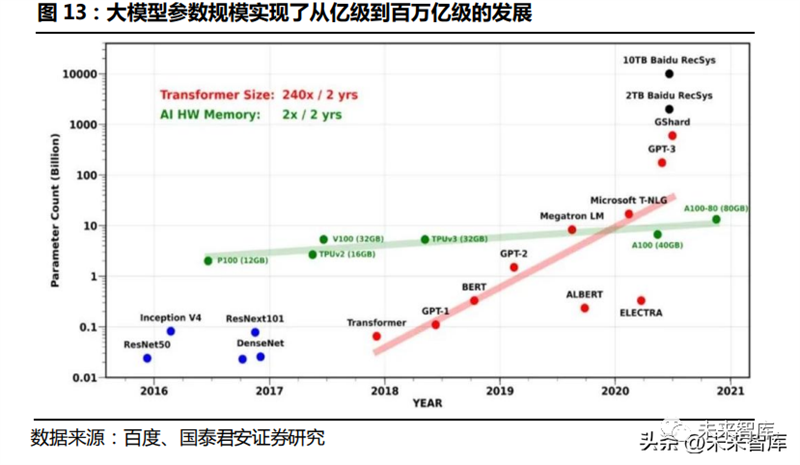 大模型 = 预训练+微调。从 2017 年 Transformer 开始,到 GPT-1、BERT、GPT2、GPT-3、GPT-4 模型的出现,模型的参数量级实现了从亿到百万亿量级的突破, 大模型(预训练模型、Foundation Models)在无标注的数据上进行预训练,利用 专用的小规模的标注数据对模型进行微调(fine- tuning),可用于下游任务预测。迁移学习是预训练模型的主要思想,当目标场景数据不足时,先在数据量大的公开 数据集上训练基于深度神经网络的 AI 模型,然后将其迁移到目标场景中,通过目标 场景中的小数据集进行微调,使模型达到要求的性能。预训练模型极大地减少了模 型在标记数据量下游工作的需要,从而适用于一些难以获得大量标记数据的场景。