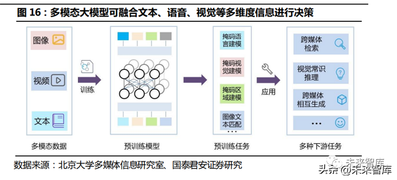 决策:通用语言、环境感知能力是自动化决策的基础,多模态大模型契合人形机器 人的决策需求。单一模态智能无法解决设计多模态信息的决策问题,如“语音告知 机器人去取桌子上绿色苹果”的任务。多模态统一建模,目的是增强模型的跨模态 语义对齐能力,使模型逐步标准化,使得机器人能综合视觉、语音、文本多维度信 息,实现各感官融合决策的能力。基于多模态的预训练大模型或将成为人工智能基 础设施,增强机器人可完成任务的多样性与通用性,让其不只局限于文本和图像等 单个部分,而是多应用相容,拓展单一智能为融合智能,使机器人能结合其感知到 的多模态数据实现自动化决策。