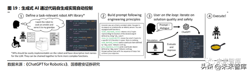 控制:生成式 AI 赋能机器人自我控制,最终形成感知、决策、控制闭环。使得人形 机器人具备通用能力,首先需要其具备“常识”,即通用的语言理解能力(语音)和 场景理解能力(视觉);其次需要其具备决策能力,即接收指令后产生的对任务的拆 解;最后,需要其具备自我控制和执行性能,生成式 AI 的代码生成能力将最终使得 机器人的感知、决策、动作形成闭环,达到自我控制的目的。事实上,近来微软团 队已经尝试将 ChatGPT 应用于机器人控制的场景中,通过提前写好机器人底层函 数库,并对其描述功能作用及目标,ChatGPT 能生成完成任务的代码。在生成式 AI 的推动下,机器人编程的门槛将会慢慢降低,最终实现自我编程、自我控制,并完 成人类习以为常的通用任务。