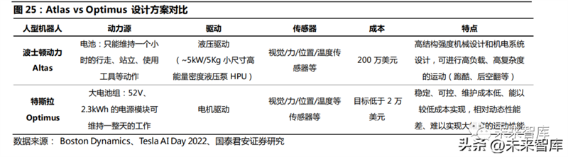 波士顿动力 Altas 定位于技术的前瞻性研究,侧重探索技术应用的可能性而非商业 化。从硬件架构来看, Altas 具备出色的动态性能、瞬时功率密度和稳定的运动姿 态,可以实现高负载、高复杂度的运动, 像是一场技术驱动的盛宴。商业化并非波士 顿动力当前主要考量因素,Altas 项目更多作为一个研究平台供研究者进行学术试 验,侧重探索技术应用的可能性而非商业化。特斯拉 Optimus 发心于人形机器人的规模化、商业化、标准化,商业化的目标驱 动下,成本、能耗成为特斯拉团队的考量指标。