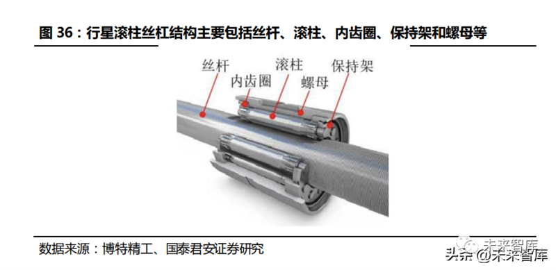 行星滚柱丝杠以其高承载、高刚度、长寿命的特点或成为人形机器人线性执行器的 关键传动装置,通过适配人形机器人需求实现降本是大规模放量的前提。根据 Tesla AI Day 2022 会上展示的信息来看,Optimus 线性执行器采用的方案即为行星滚柱 丝杠一体式伺服电动缸。我们认为下肢髋、膝、踝关节及上肢的肘关节的伺服电缸 采用高承载、高刚度的行星滚柱丝杠作为传动装置可能性比较大。行星滚柱丝杠结 构复杂、加工难度大因而成本很高,通过调整设计、工艺方案适配人形机器人的需 要来实现降本是其大规模应用的前提。