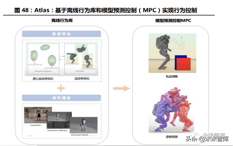 波斯顿动力 Atlas:基于离线行为库和模型预测控制(MPC)实现行为控制 离线行为库基于轨迹优化算法(质心运动学优化+运动学优化)和动作捕捉(Motion Capture)创建,技术人员可通过向库中添加新轨迹为机器人添加新功能;机器人被 指定行为目标后,从行为库中选择尽可能接近目标的行为,获得理论上可行的动态连续动作。模型预测控制(MPC)根据传感器反馈的实时信息,基于行为库调整部 分参数(力、姿势、关节动作时间等)的细节,以适应真实环境同理想的差异和其 他实时因素。MPC 这种在线控制方式允许机器人偏离模版行动,同时可以为两个行 为(如跳跃和后空翻)间预测过渡动作,简化了行为库的创建过程。