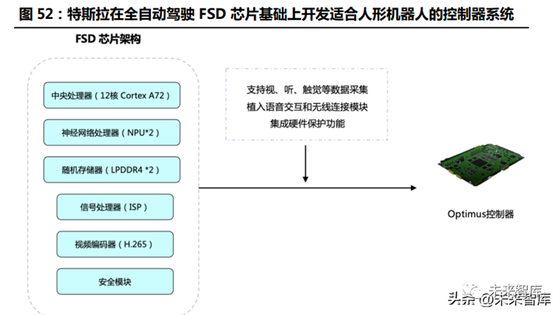 特斯拉 Optimus:复用特斯拉汽车的感知和计算能力,在全自动驾驶 FSD 芯片基 础上开发适合人形机器人的控制器系统 。FSD 芯片集成了中央处理器、神经网络处理器(NPU)、图像处理器(GPU)、同步 动态随机存储器(SDRAM)、信号处理器(ISP)、视频编码器(H.265)和安全模 块,能高效率地实现图像处理、环境感知、通用计算和实时行为控制。为了匹配人 形机器人和汽车的需求差异,Optimus 控制器芯片在 FSD 芯片基础上做了适应性 修改,增加了对视、听、触觉等数据采集实现多模态信息输入支持,植入语音交互 和无线连接模块支持人机沟通,具备硬件保护功能以保障机器人和周边人员安全, 进而实现行为决策和运动控制。